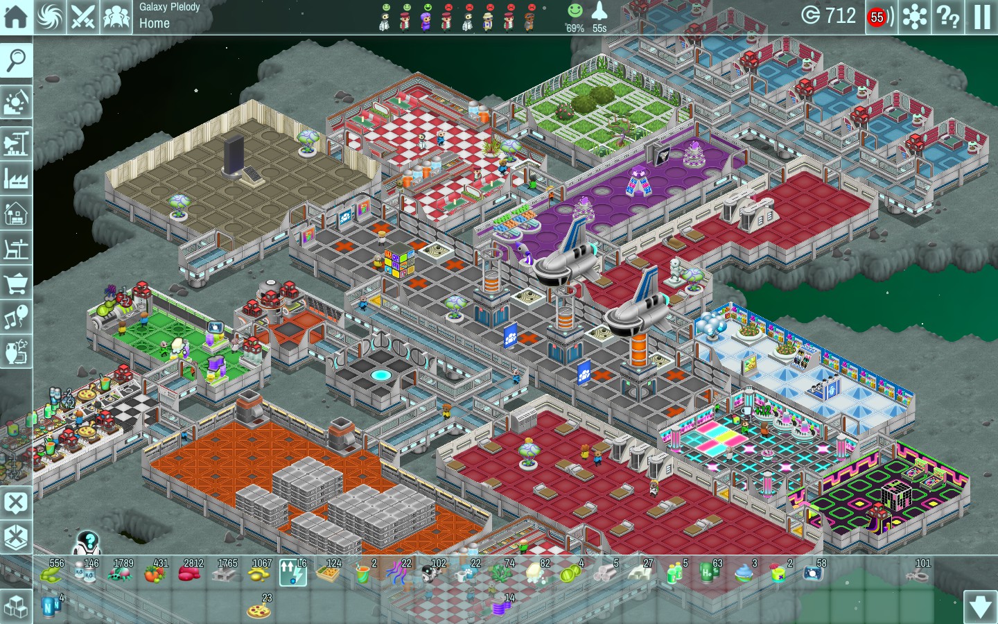 At the beginning you’re given an air lock on an asteroid and five crewmen and it’s up to you to decide how best to build your station, hire new officers, send your team on missions (which you control), send your crew on random missions with a percentage chance of success based on their level (which you don’t control), or simply have your crew building up the station or working the various food manufacturing and goods manufacturing factories to keep your station supplied. The more you level up your crew the better they get (working quicker, or building faster), but on the downside they also get more needy, beginning with just wanting a place to sleep but leading on to hunger, thirst, hygiene, entertainment etc and craving specific things along the way.